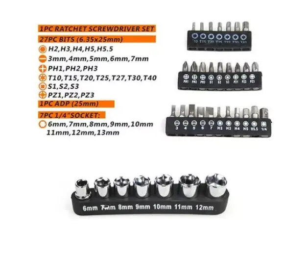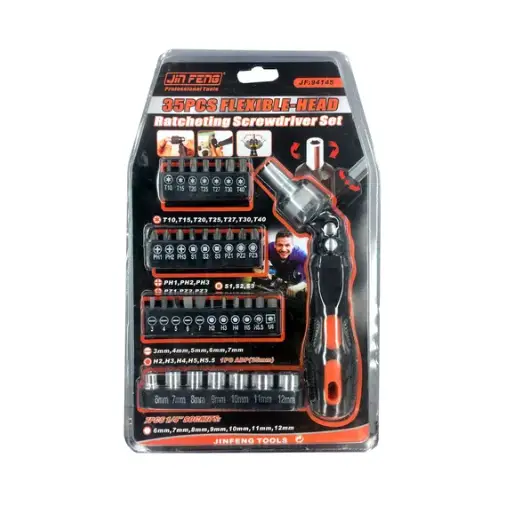 مجموعه 35عددی پیچگوشتی تاشو جغجغه ای سانشنگ دارای 27عدد انواع نوک پیچگوشتی در سایزها و مدل های مختلف ، 7عدد بکس پرمصرف ، قابلیت تاشوندگی پیچگوشتی و قابلیت جغجغه ای میباشد. این مجموعه مناسب برای تعمیرات موبایل ، امور خانگی و امور تعمیراتی میباشد.