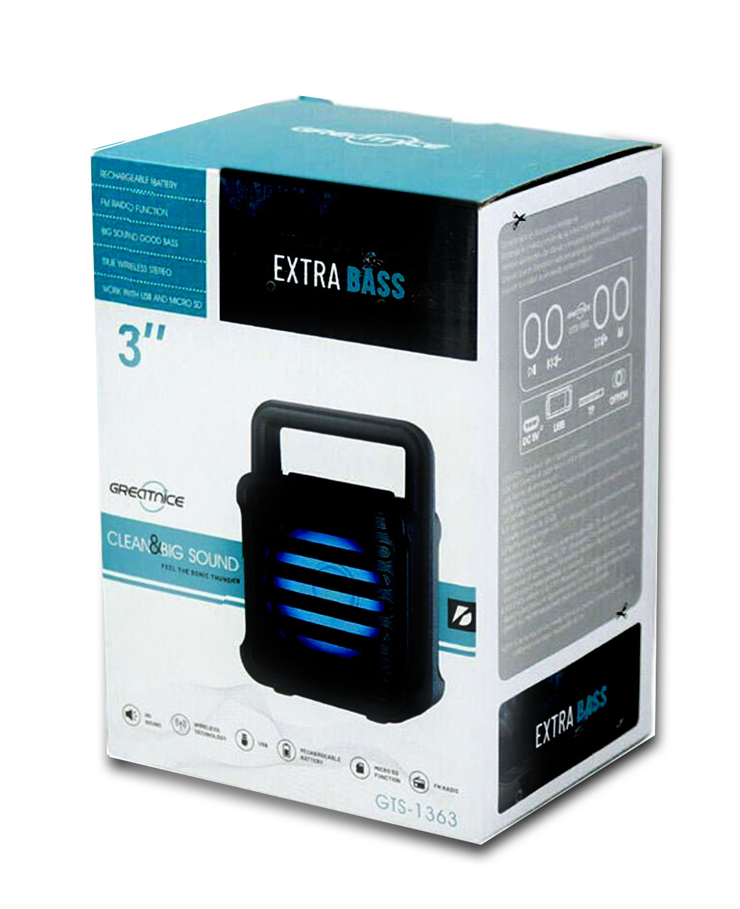 اسپیکر بلوتوثی مدل GTS-1363 یک اسپیکر چمدانی و جمع و جور که باتوجه به سایز مناسبی که دارد مناسب مسافرت و کمپینگ ها و همچنین مناسب استفاده در خودرو و قطار میباشد. ابعاد اسپیکر۸۰x۹۵x۱۴۰ میلیمتر و دارای وزن 250 گرم میباشد.جنس بدنه از پلاستیک ABS ساخته شده است که در مقابل فشار و ضربه مقاومت بالایی دارد. برای متصل شدن به اسپیکر بلوتوثی مدل GTS-1363 علاوه بر بلوتوث میتوان از کارت USB . SD هم استفاده نمود. کلید هایی که در پشت دستگاه تعبیه شده اند برای تنظیم ولوم صدا و رفتن به آهنگ قبلی و بعدی و توقف و پخش موسیقی میباشد.
