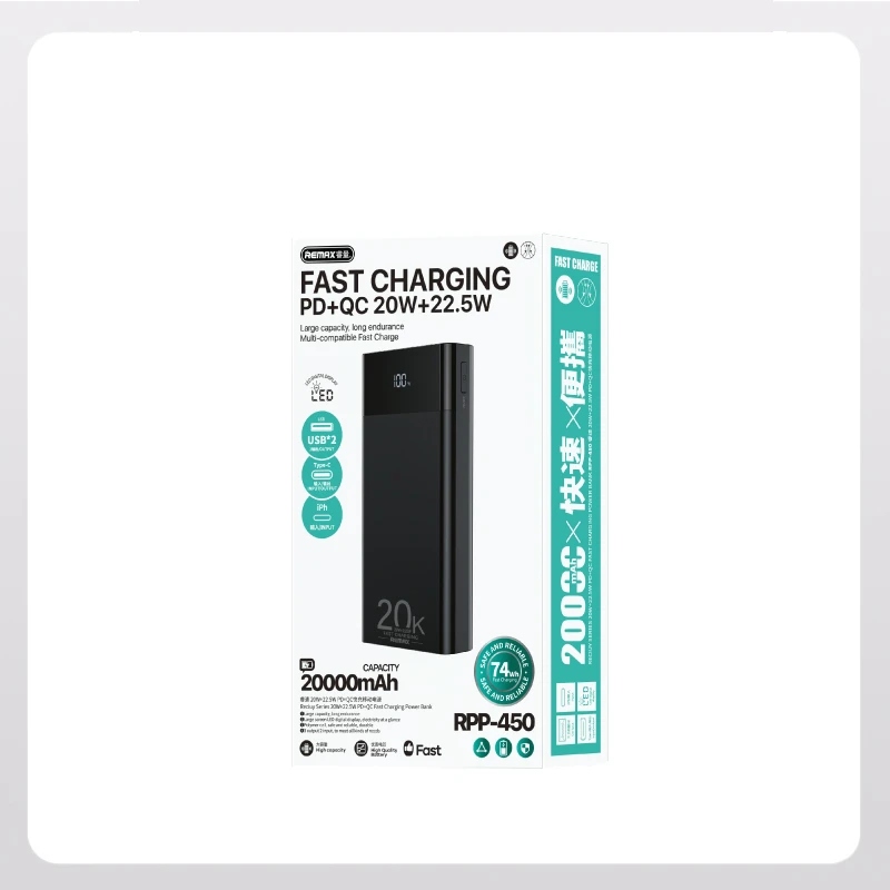 پاوربانک ریمکس مدل RPP-450-22.5W یک محصول جذاب و ساخته شده از آخرین فناوری روز دنیا می باشد.ظرفیت اسمی این پاوربانک 20000 میلی آمپر است که توانایی شارژ دستگاه شما را تا 22.5 وات دارد و از فناوری فست شارژ نیز پشتیبانی میکند . این پاوربانک قدرتمند از فناوری NTC بهره می برد. حسگر دمای NTC به طور هوشمند شرایط دما را تشخیص میدهد. هنگامی که دما به مقدار تعیینشده میرسد، به طور خودکار توان خروجی را تنظیم میکند و به طور مؤثر افزایش دما را برای دستیابی به شارژ ایمن کنترل میکند. بدنه این محصول از جنس ABS + PC ساخته شده که مقاومت بالایی در برابر ضربه و خط وخش دارد. ابعاد جمعوجور (142 × 68 × 28 میلیمتر) و وزن متوسط (410 گرم) باعث شده تا این پاوربانک به راحتی قابل حمل باشد و برای استفاده روزمره یا سفر کاملاً مناسب باشد. این پاوربانک دارای دو پورت خروجی USB-A و یک پورت Type-C با ماکزیمم توان 22.5 وات است و از فناوریهای شارژ سریع PD و QC پشتیبانی میکنند. و همچنین قابلیت شارژ همزمان سه دستگاه را داراست. برای شارژ این پاوربانک دو پورت ورودی در نظر گرفته شده است. پورت اول TYPE-C با ماکزیمم توان 18 وات و پورت دوم لایتنینگ با ماکزیمم توان 20 وات است. میزان شارژ این دستگاه از طریق نشانگر دیجیتالی است که روی آن تعبیه شده است و میتوانید در هر لحظه میزان شارژ دستگاه را مشاهده نمایید.